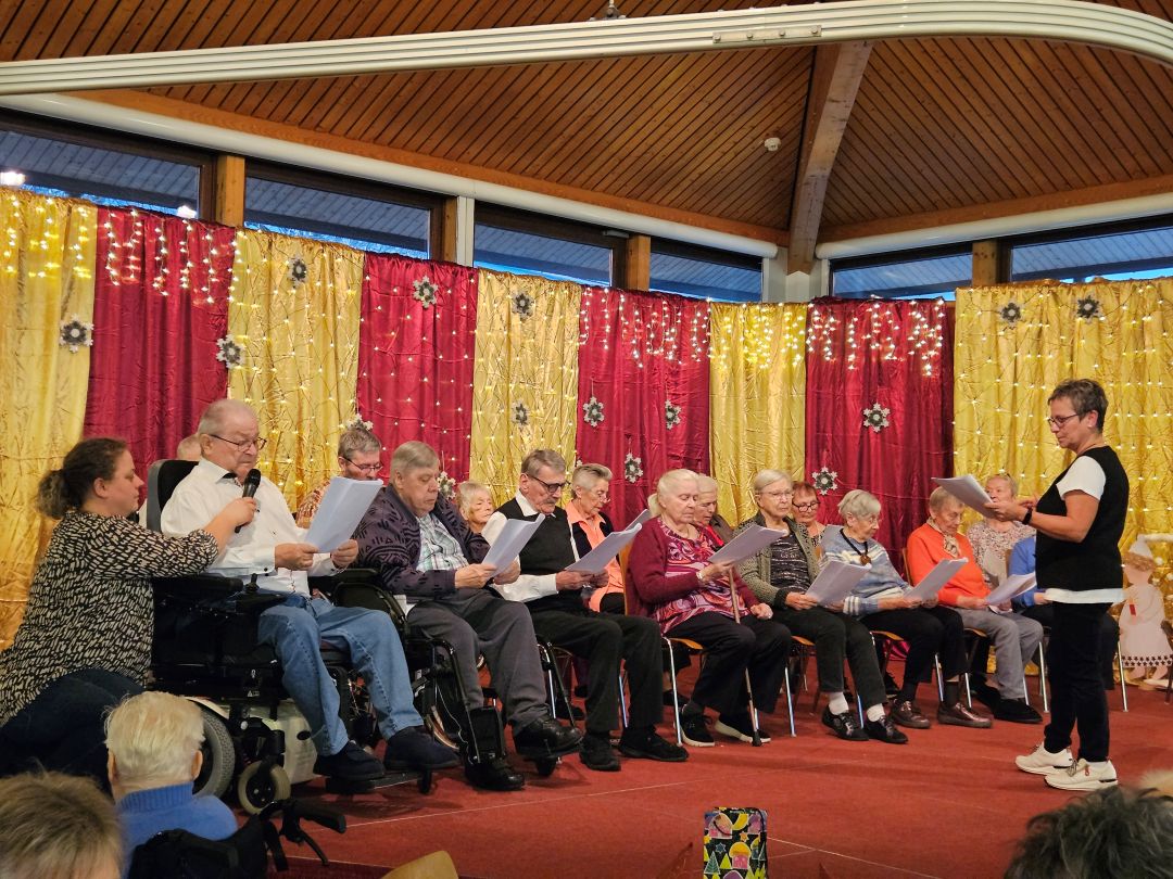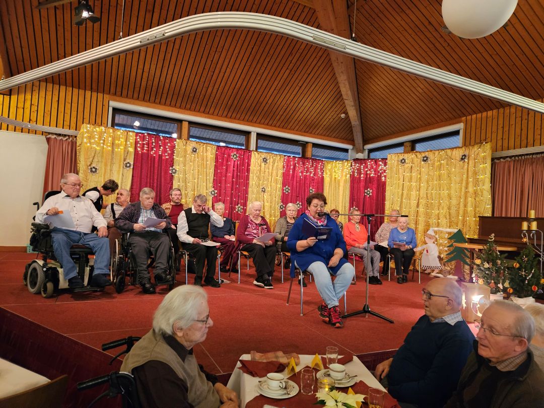 Der „Stüble-Chor“ besteht aus Bewohnerinnen und Bewohnern des Kreisseniorenzentrums, die unter Leitung von Gaby Strudel etliche Weihnachtslieder einstudiert hatten, sogar einschließlich einer männlichen Solostimme.