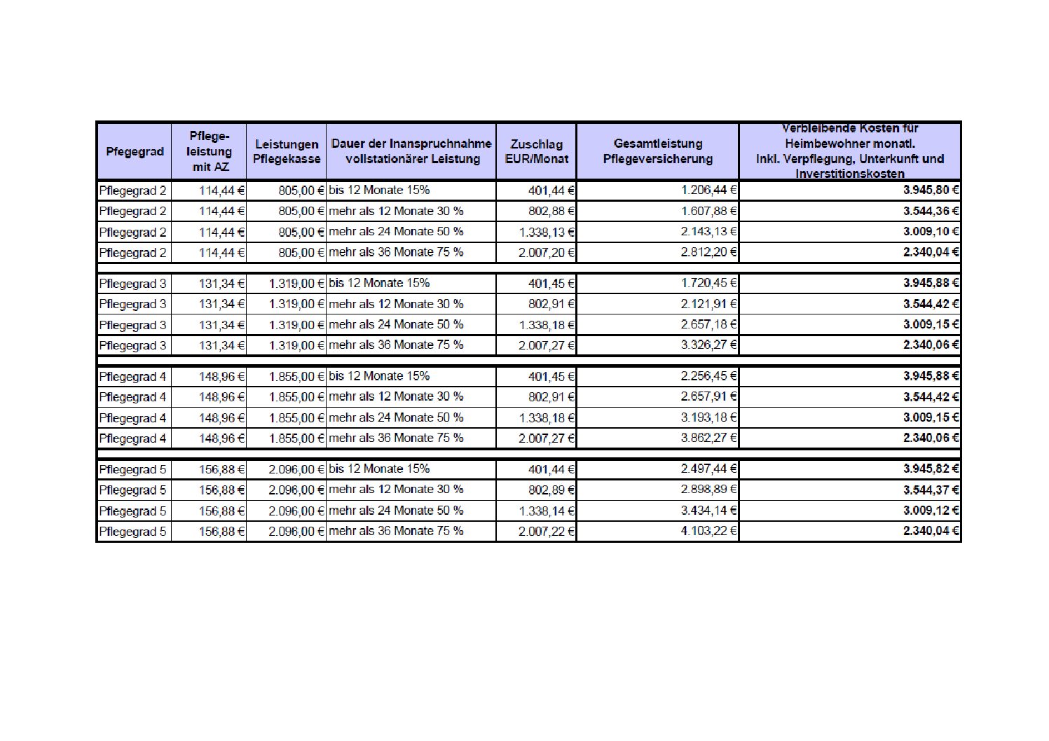 Unsere Pflegesätze und Preise